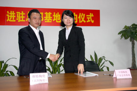 2008年12月25日上午,來自江西的太陽陶瓷有限公司總經理胡精斌與中國陶瓷產業總部基地營運總經理余敏,于中國陶瓷產業總部基地正式簽署合作協議,宣布進駐中國陶瓷產業總部基地。