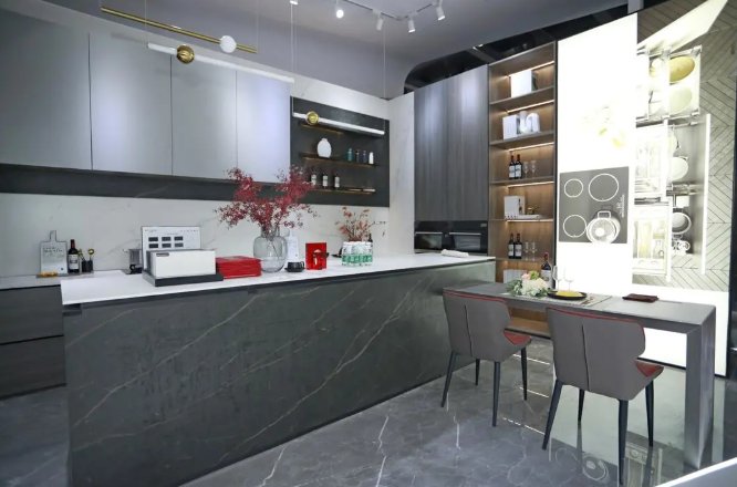 本次展會是華巖品致巖板第一次亮相廣州建博會,展館以‘質感巖板家居,品致美好生活’為主題,為觀眾生動地呈現了櫥柜面板、巖板家具、墻面、地面、臺面板等五大應用系統。