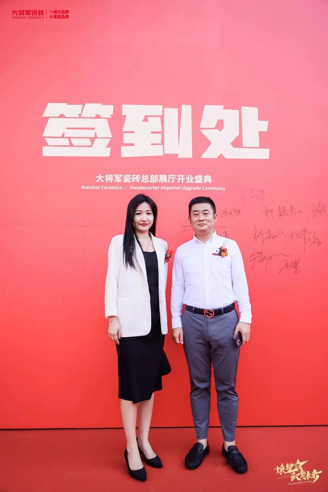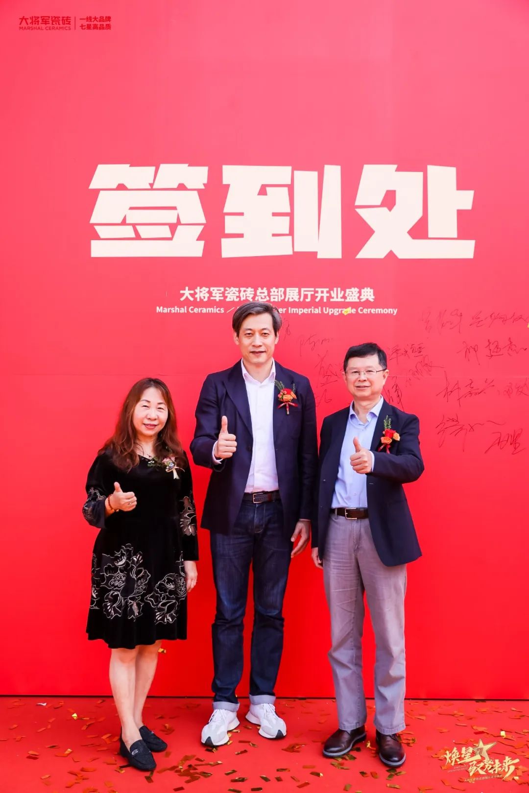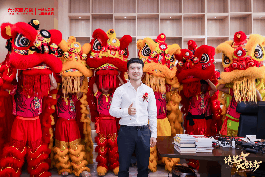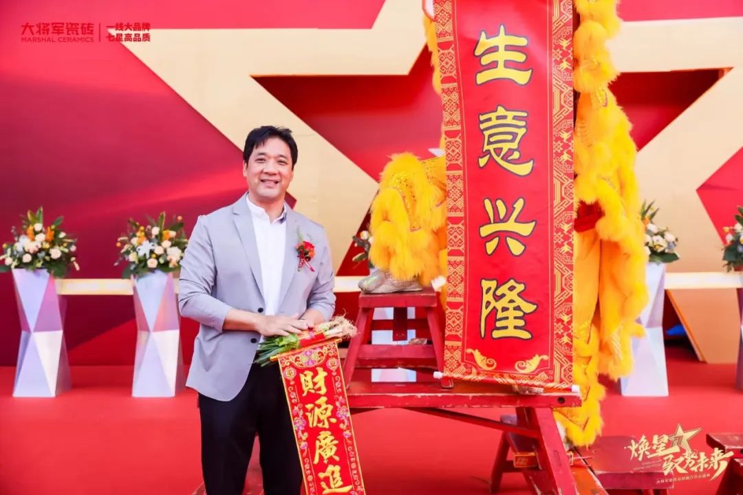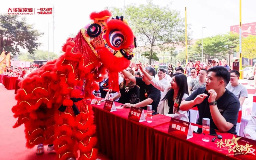慶典當(dāng)天,鑼鼓喧天,醒獅獻(xiàn)瑞。花籃簇?fù)恚瑲g聲笑語。現(xiàn)場布置紅紅火火,處處洋溢著歡樂喜慶的氛圍。領(lǐng)導(dǎo)、嘉賓和經(jīng)銷商客戶陸續(xù)進(jìn)場簽到,共同祝賀大將軍瓷磚展廳開業(yè)大吉、財(cái)源廣進(jìn)、宏圖大展!