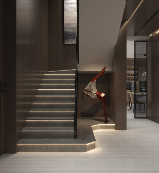餐廳以奢石圓桌和皮質(zhì)餐椅為主,用深色調(diào)打造復(fù)古知性的氛圍,開(kāi)放式廚房將光線(xiàn)引入,擺脫了原廚房的封閉感,尤其地面奢石的運(yùn)用,會(huì)給人歲月的沉淀感。樓梯不僅能承擔(dān)著中轉(zhuǎn)的作用,奢石階梯也飽含著藝術(shù)的雋永,延續(xù)著素雅的配色,奢石紋理自帶高級(jí)貴氣的場(chǎng)域。