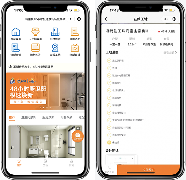 “48小時廚衛陽極速煥新”小程序是家先生全新打造的官方廚衛陽煥新服務體系。該體系集“廚房煥新”、“浴室煥新”和“陽臺煥新”、“自由選配”、“在線工地”等功能于一體,是一款煥新有保障、更快捷、個性化煥新需求的煥新服務體系。