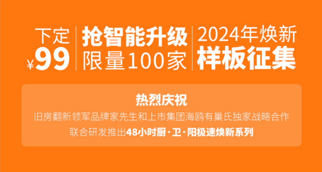 中國舊房翻新領軍品牌-家先生和上市集團海鷗住工-有巢氏獨家戰略合作聯合研發推出48小時廚衛陽極速煥新系列。2024年煥新樣板征集,下定¥99搶智能升級(限量100家)!