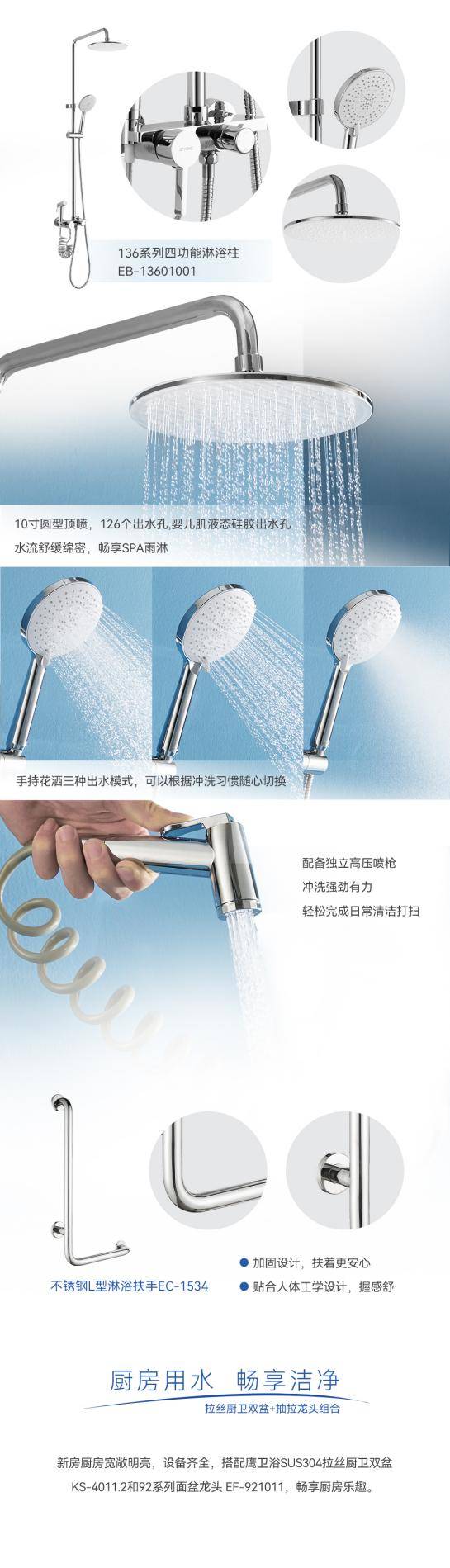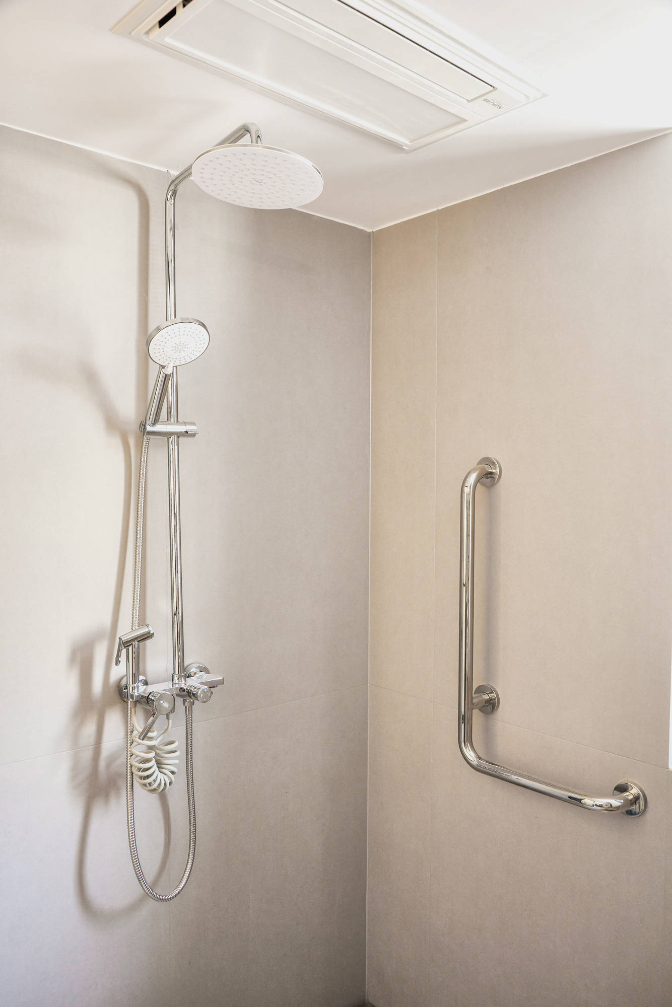 淋浴區安裝的無軌移門實現了地面的無障礙設計,既實現干濕分離,又方便淋浴。精心選配136系列四功能淋浴柱EB-13601001,并貼心裝上L型淋浴扶手,帶來安全舒適淋浴體驗。