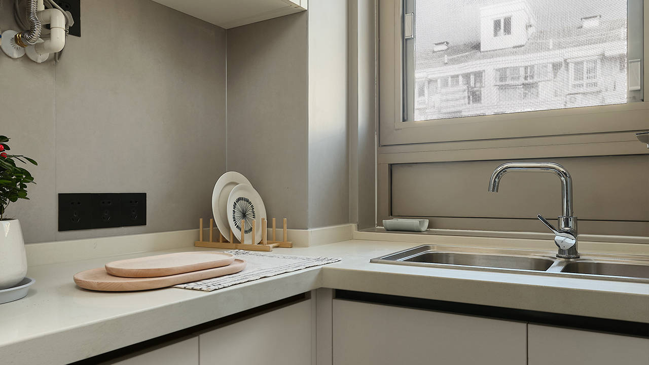 新房廚房寬敞明亮,設備齊全,搭配鷹衛浴SUS304拉絲廚衛雙盆KS-4011.2和92系列面盆龍頭EF-921011,暢享廚房樂趣。