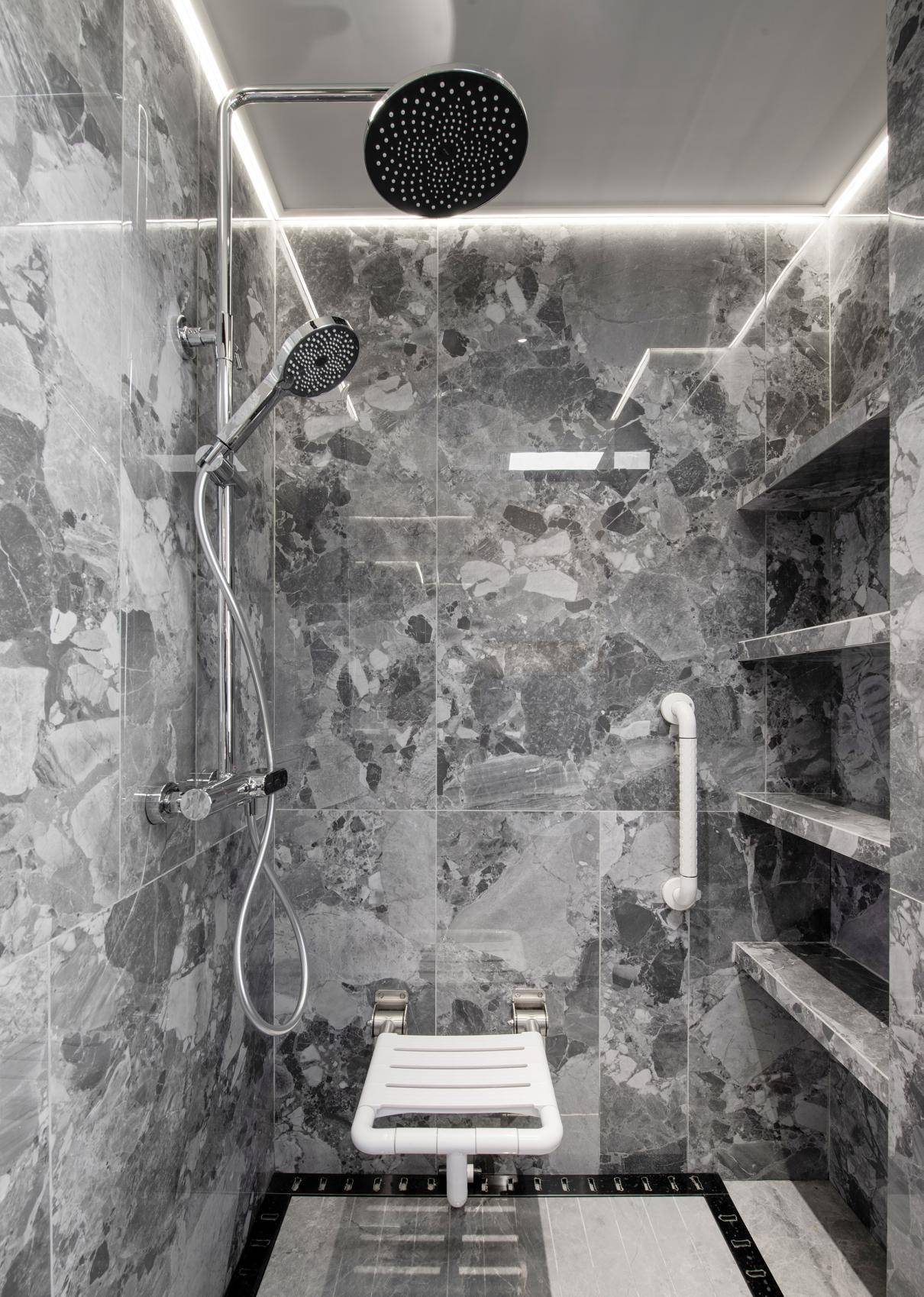 改造后,設計師調整衛生間布局,衛生間外新增一個洗漱區,衛生間內干濕分區,劃分出如廁區、淋浴區、洗漱區。經過設計師與鷹衛浴團隊的深入討論后,如廁區選用了鷹衛浴莫蘭迪系列掛墻智能坐便器BS81H,搭配SP5010E隱藏式水箱,增加一字扶手EC-1520,為安全如廁保駕護航。淋浴區選用135系列恒溫淋浴柱EB-13501001TH,手持花灑桿可升降,并增加無障礙設施,折疊座椅及扶手,大大提升了齊文英使用的安全性和舒適性,帶來多一份關懷與溫暖。