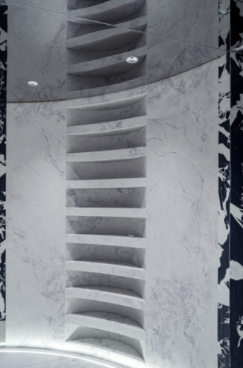 全展廳以入口區(qū)-水吧區(qū)-洽談區(qū)-工法展示區(qū)-情景樣板區(qū)-選材區(qū)-弧形工藝區(qū)作動(dòng)線,設(shè)計(jì)獨(dú)具匠心,并融合了西安的歷史文化與現(xiàn)代設(shè)計(jì)理念。將自然環(huán)境、場(chǎng)地記憶、城市形象結(jié)合起來(lái),奢石質(zhì)感和材質(zhì)的多樣性,呈現(xiàn)千變?nèi)f化的建筑姿態(tài),創(chuàng)造出一個(gè)既可以代表品牌未來(lái)形象又不失藝術(shù)感的高定旗艦店。
