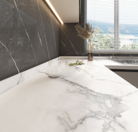 用簡單而克制的方式描繪真實的生活場景,亮面奢石門板在陽光的照射之下,整個廚房空間看起來更加明亮寬敞,整齊劃一的櫥柜美觀整潔,也注重實用性,讓臺面空間得到充分釋放,家電隱匿式設計,極大提升空間可利用率,不僅清爽整潔美觀,還保留了廚房的整體性,活動更加自由。