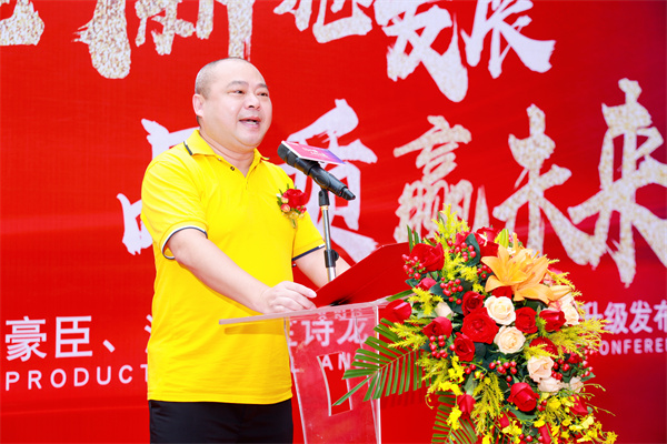 裕輝集團·【豪臣、鴻景、寶詩龍、科牛】營銷總經理黃炯輝上臺致辭:黃總明確各品牌產品和營銷雙輪驅動戰略規劃,會加強注重產品創新并推進渠道下沉。市場瞬息萬變,挑戰近在咫尺,面對激烈的市場競爭環境,豪臣、鴻景、寶詩龍、科牛四個品牌會立足長遠,全局統籌策劃,順應消費年輕化趨勢,積極調整品牌、產品、渠道、營銷等領域的戰略布局,加強線上引流與銷售,促進線上線下融合,緊跟時代步伐,把握流量機遇,以研產銷一體化驅動發展,共筑品牌新高度,愿與全球合作伙伴們一起齊心協力,共創裕輝!