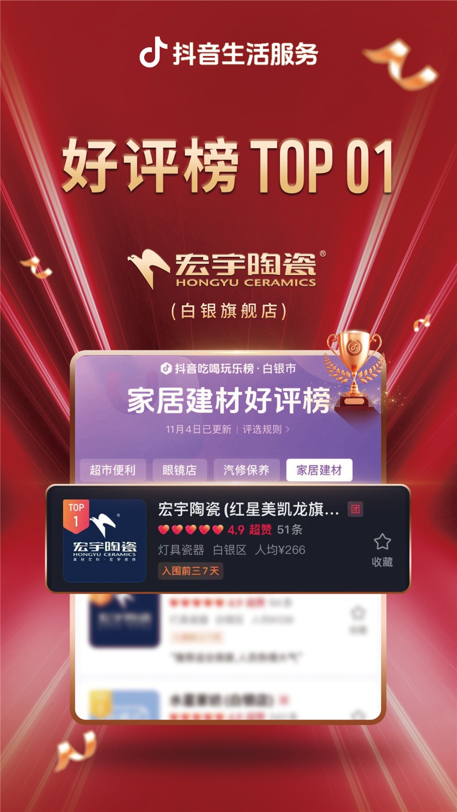 宏宇陶瓷“千城霸榜行動(dòng)計(jì)劃”強(qiáng)勢(shì)來襲,席卷全國(guó)。雙11狂歡購(gòu)活動(dòng)期間,宏宇陶瓷全國(guó)多地門店在激烈的市場(chǎng)競(jìng)爭(zhēng)中持續(xù)保持強(qiáng)勁勢(shì)頭,一舉奪魁,榮登抖音同城家居建材好評(píng)榜榜首,成為眾多消費(fèi)者信賴的首選品牌。
