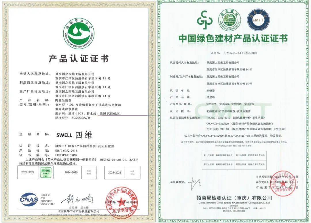 除了金獎的榮耀,四維還擁有一系列國內外權威認證的加持,包括綠色建材認證、節(jié)水認證、ISO45001安全體系證書、ISO9001質量證書等。這些認證不僅是對四維在品質管理、安全管理及環(huán)保節(jié)能方面卓越成就的認可,更是對四維在全球市場競爭力的有力證明。我們始終將環(huán)保、健康、安全作為產品設計的核心理念,致力于為消費者提供高品質、高性能的衛(wèi)浴解決方案。