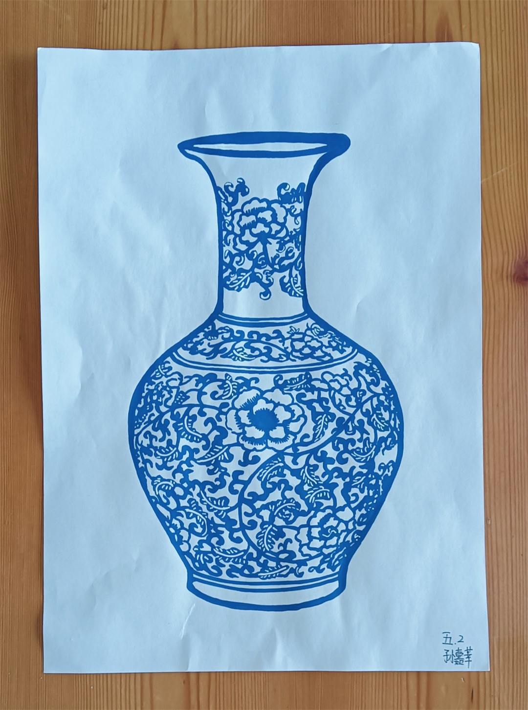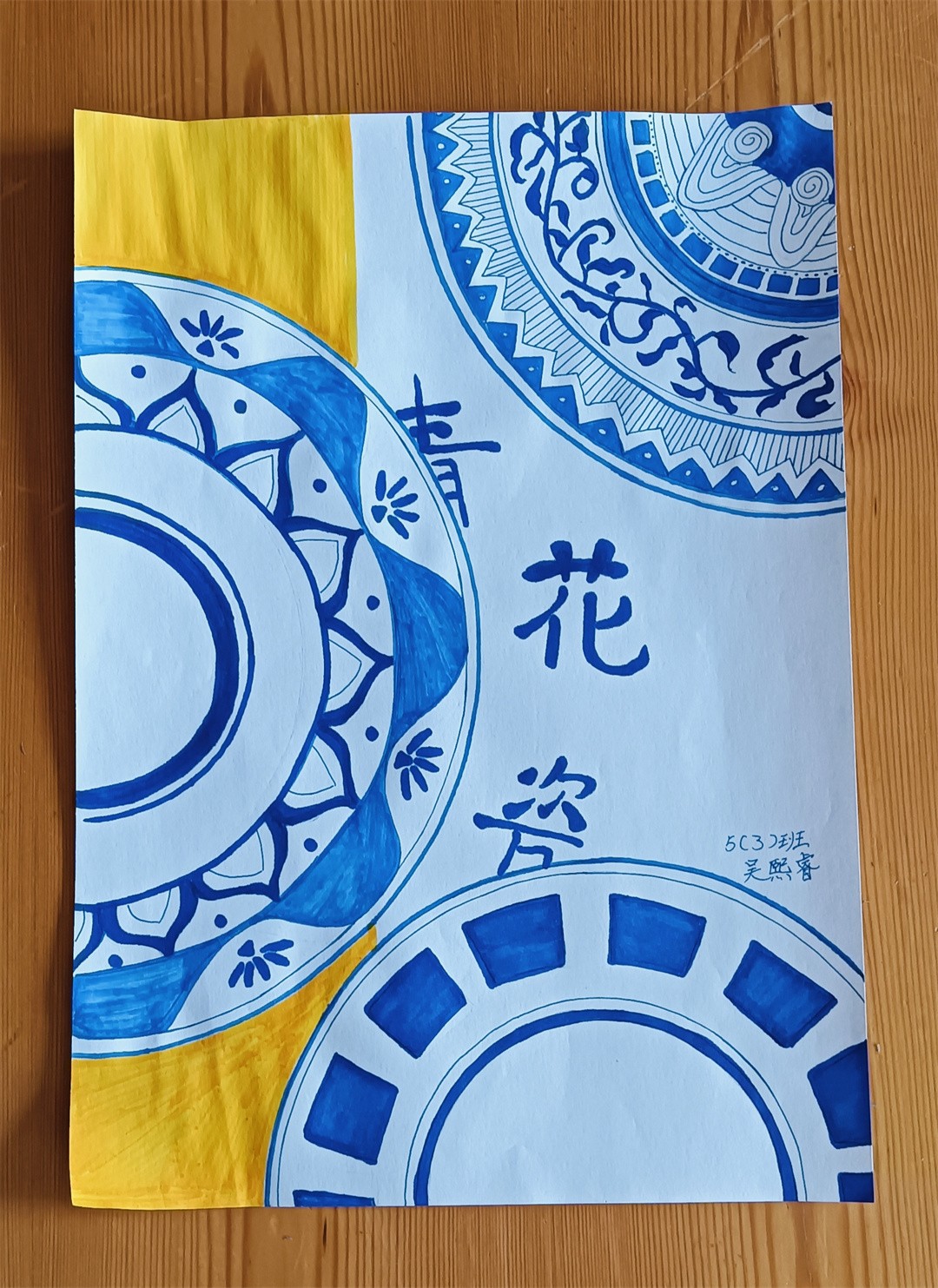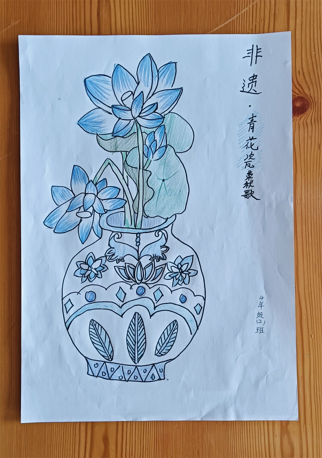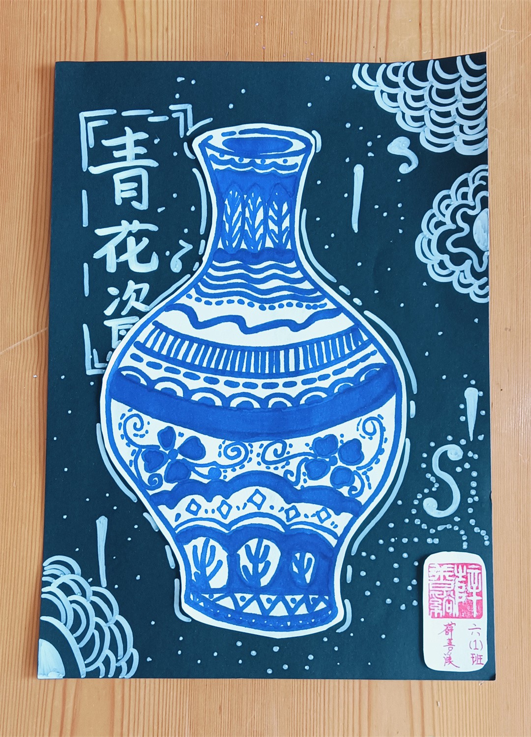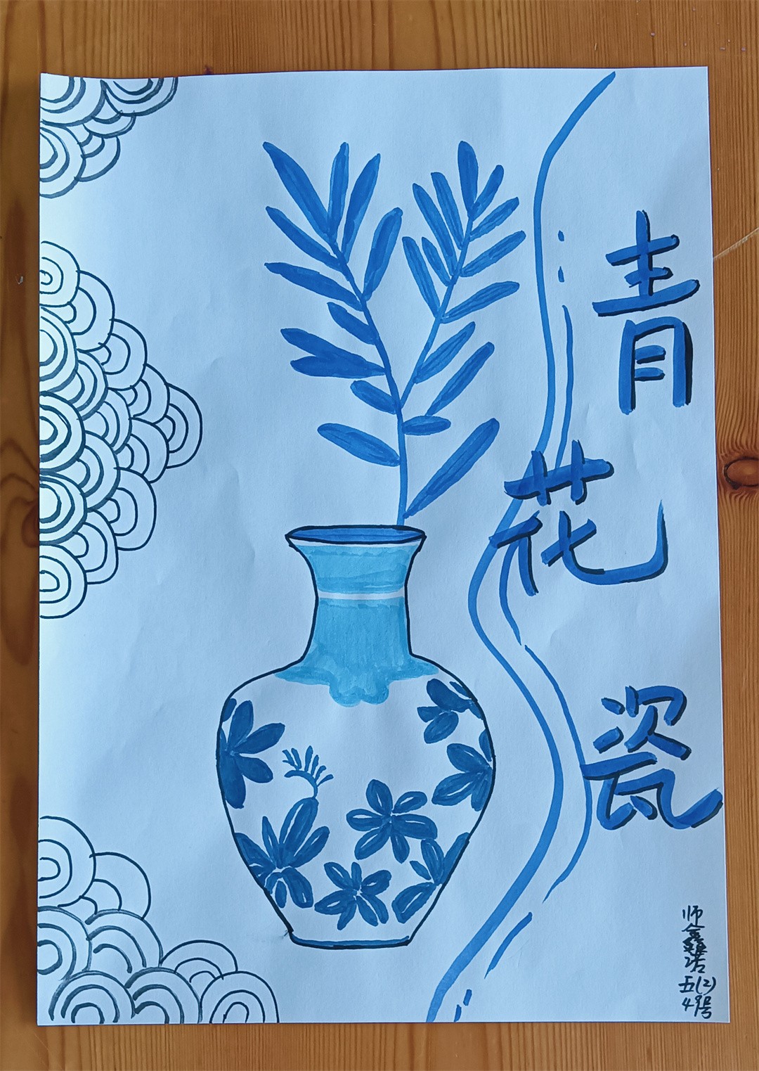 青花瓷線描,1、輪廓起稿,觀察青花瓷圖片資料,用鉛筆分出瓶口、瓶身、瓶底區域,注意線條方向,不是直線條。2、用鉛筆勾勒出花紋,注意用鉛筆時,筆要輕。3、用藍色馬克筆勾勒出花紋,完成后要把鉛筆印擦掉。4、用藍色馬克筆加花紋、畫色塊,刻畫細節部分,使畫面更豐富。最后寫上班級、姓名。隨后,在陶藝老師的指導下,同學們拿起畫筆,巧妙構圖,每一筆細致的勾勒,每一劃深情的描繪,同學們的設計作品,構圖完整,造型可愛,線條流暢自如,展現了同學們獨特的藝術視角和豐富的想象力,每一幅作品,都是同學們對傳統文化的一個深刻詮釋與獨特表達。陶藝課不僅提高了同學們的動手與藝術設計能力、審美能力和創造力,還增進了同學們對青花瓷文化的理解與欣賞,從中了解青花瓷的特點,領略青花瓷的清秀典雅,感受著青花瓷器的精美絕倫。助力同學們在藝術的滋養中茁壯成長。