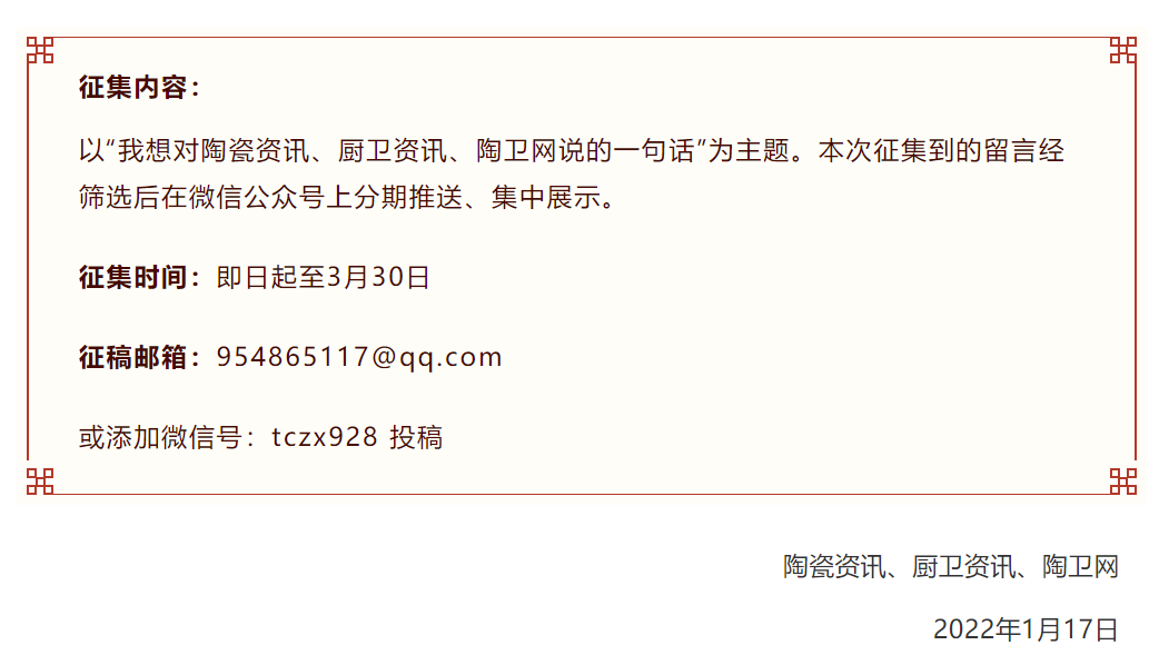2022年4月,陶瓷資訊、廚衛資訊、陶衛網將迎來十五周年生日。在過去的十五年中,陶瓷資訊、廚衛資訊、陶衛網見證了行業的進步并為推動行業發展,提供寶貴資訊內容作出貢獻;而陶瓷資訊、廚衛資訊、陶衛網的成長也離不開行業人士的一路見證。