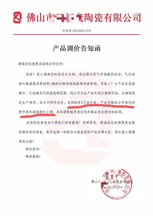 近日,廣東又一家陶企宣布產品調節告知函。該公司的函告內容顯示,自2022年2月26日起,產品價格在公司制定的原開單價基礎上進行上調,具體調價服務向所屬業務經理咨詢。