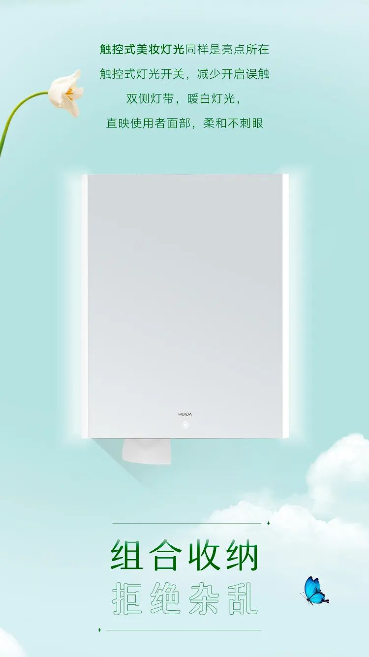 觸控式美妝燈光,同樣是亮點所在,觸控式燈光開關,減少開啟誤觸。雙側燈帶,暖白燈光,直映使用者面部,柔和不刺眼。