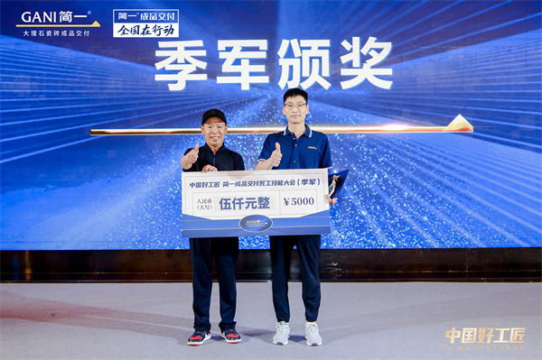 5月24日,由中國建筑裝飾協會、GANI簡一、工匠(北京)俱樂部聯合主辦,中國建筑衛生陶瓷協會、中國陶瓷工業協會瓷磚粘貼技術專業委員會、亞太酒店設計、美國《室內設計》、東方雨虹、沃能工具作為支持單位,“中國好工匠·簡一成品交付瓦工技能大會”在北京北辰五洲皇冠酒店隆重舉辦。東莞曾紀雄以精湛技藝登上「中國好工匠」冠軍寶座,西安何大亮、洛陽王宏強分別獲得亞軍和季軍,武漢彭斌、北京宮能飛分別獲得最佳人氣獎和用戶滿意獎。