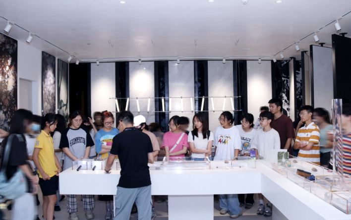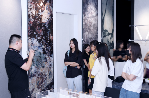 在歐若拉精工奢石高定館的參觀環節中,多位產品技術人員向廣美研學團一行進行了細致講解,向同學們詳細闡述了歐若拉精工奢石產品的創意設計、環保理念以及特色應用,大家也被品牌的獨特設計和獨特質感所吸引。同學們通過親自體驗和實際操作,感受到了創新設計所帶來的無限可能性,領略精工奢石產品與設計融合所創造的獨特魅力。