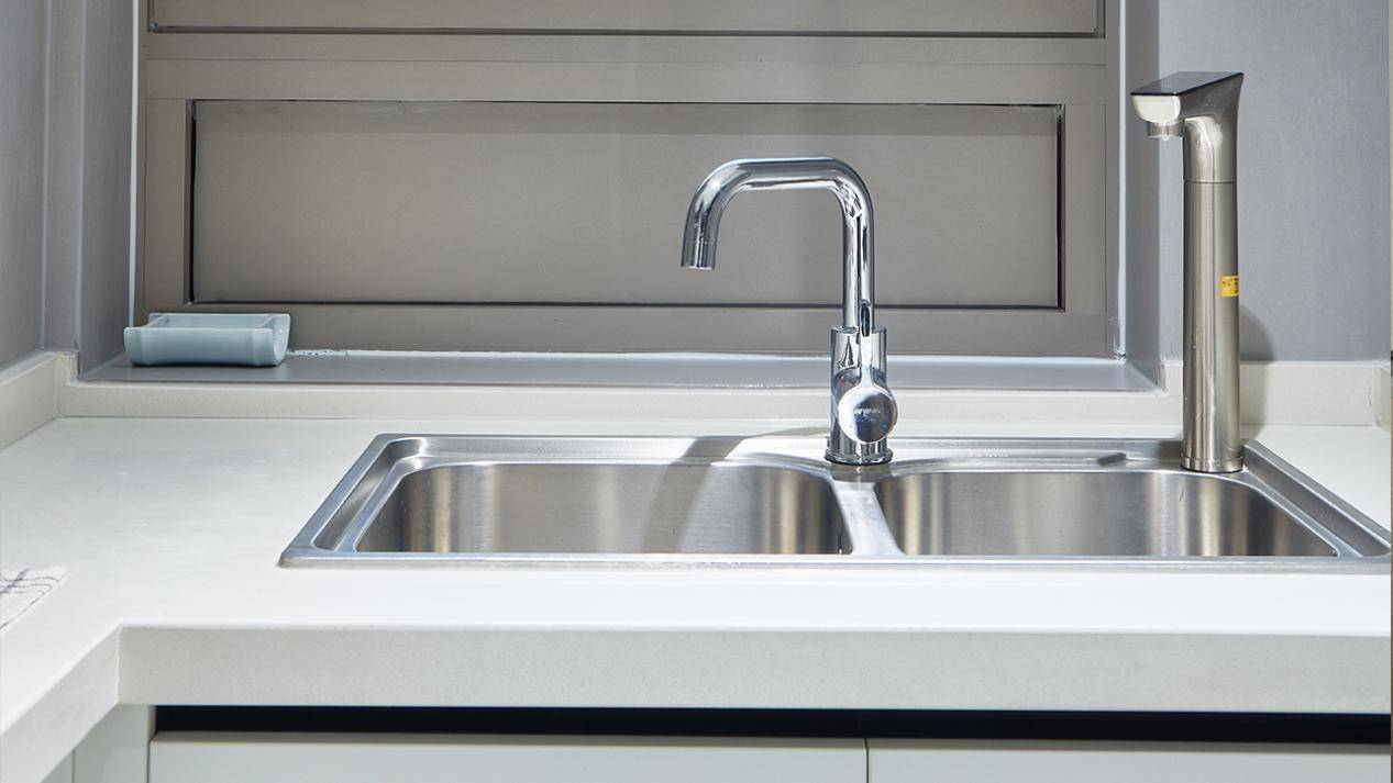 新房廚房寬敞明亮,設備齊全,搭配鷹衛浴SUS304拉絲廚衛雙盆KS-4011.2和92系列面盆龍頭EF-921011,暢享廚房樂趣。
