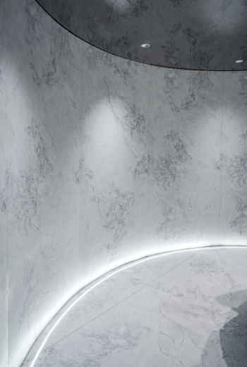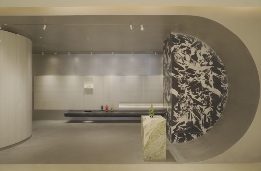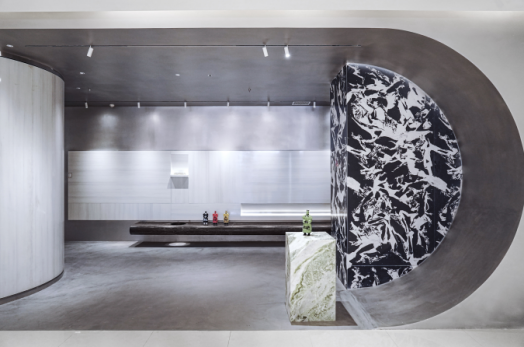 展廳外立面設(shè)計(jì)兼具建筑感和設(shè)計(jì)感,使用意大利高級(jí)涂料與精工奢石相結(jié)合,主色調(diào)運(yùn)用暗冷色襯托奢石的花紋,突顯石材材質(zhì)的同時(shí),為空間增添層次感。雙入口設(shè)計(jì)精心考量空間的尺度,通過(guò)虛實(shí)變化、材質(zhì)對(duì)比、光影流動(dòng)額細(xì)節(jié)構(gòu)造,巧妙凸顯了展廳的高級(jí)感、韻律感。水吧區(qū)域與洽談區(qū)相互為鄰,作為展廳與客戶重要的交流空間,設(shè)計(jì)師的愿景是引導(dǎo)訪客在展廳中放慢腳步,專注感受和觀察,體味那些被忽視的美好。工法展示區(qū)、情景樣板區(qū)和選材區(qū)三區(qū)聯(lián)動(dòng),清晰有力的表達(dá)出藝術(shù)性與功能性的完美結(jié)合,使客戶對(duì)工法、情景與選材流程層層遞進(jìn),一目了然。弧形工藝作為歐若拉精工奢石品牌具有一大特點(diǎn)的產(chǎn)品,鑒于奢石的功能性特征,弧形墻既要更多可能的保證其商業(yè)性的同時(shí),又能兼具回歸家的溫暖與真實(shí)。