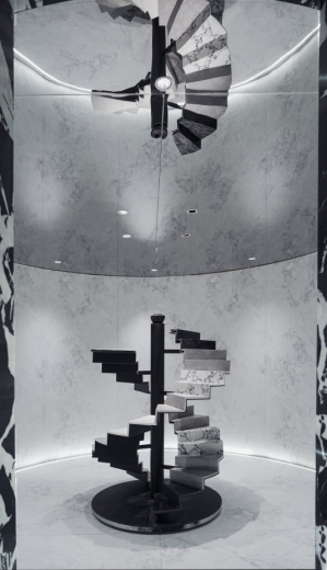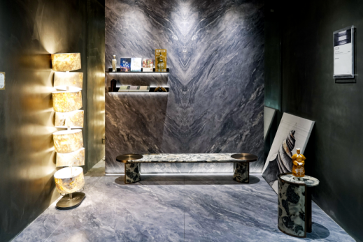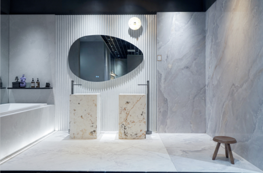 設(shè)計(jì)師通過(guò)材質(zhì)與色彩的對(duì)比,既界定了空間,又產(chǎn)生空間的視覺(jué)沖擊,通過(guò)奢石之美細(xì)節(jié)的呈現(xiàn),色彩和肌理、風(fēng)格碰撞出煥然一新的感覺(jué),呈現(xiàn)出豐富的視覺(jué)效果。全奢石空間應(yīng)用使場(chǎng)景在滿足功能使用的前提下,結(jié)合商業(yè)和文化、消費(fèi)群體畫像、西安本土文化等范疇,讓空間氛圍更具家居感和記憶點(diǎn),運(yùn)用奢石的肌理配合空間調(diào)性,突顯時(shí)尚、高品味的美感,讓消費(fèi)者充分感受到品牌的獨(dú)特魅力,并享受與產(chǎn)品的交互體驗(yàn)。