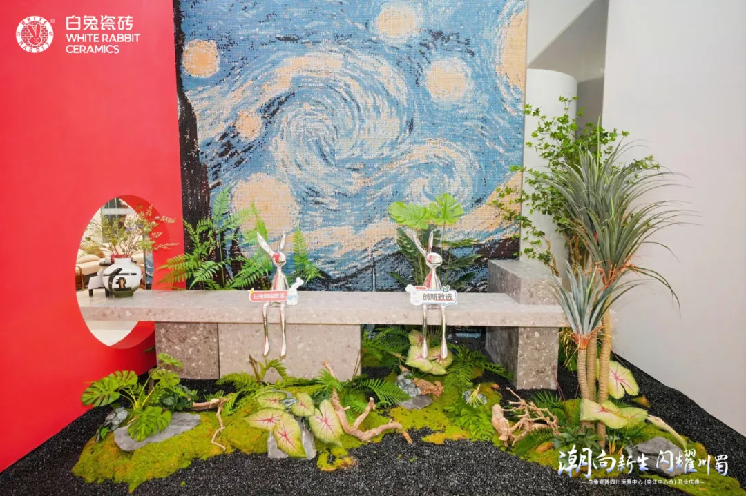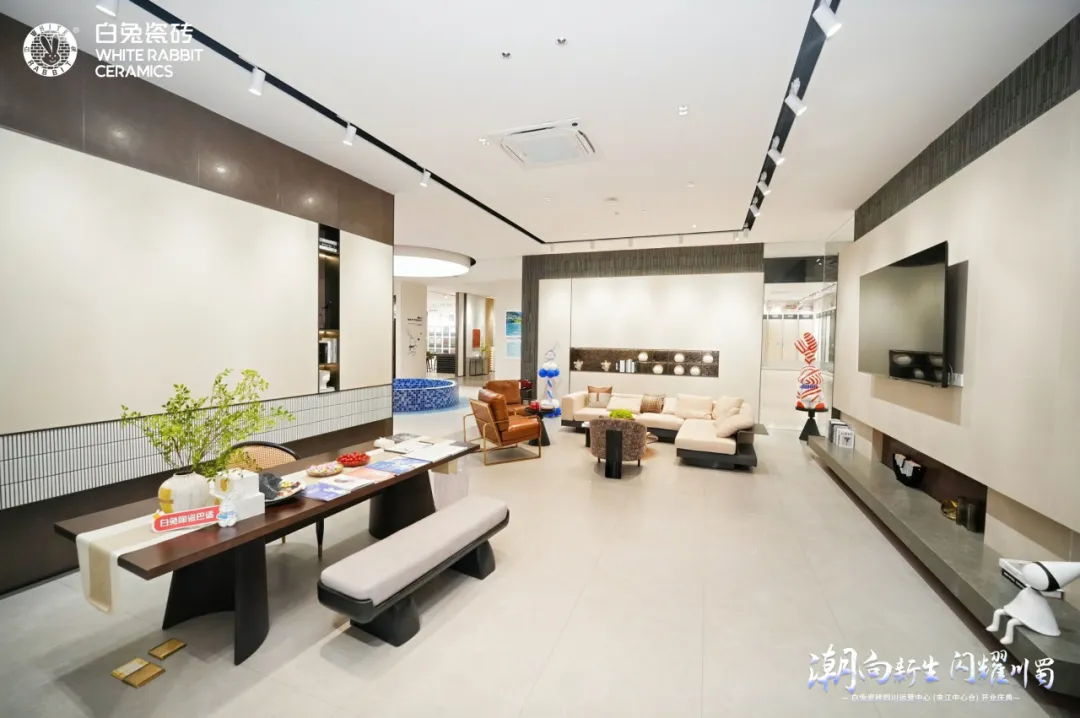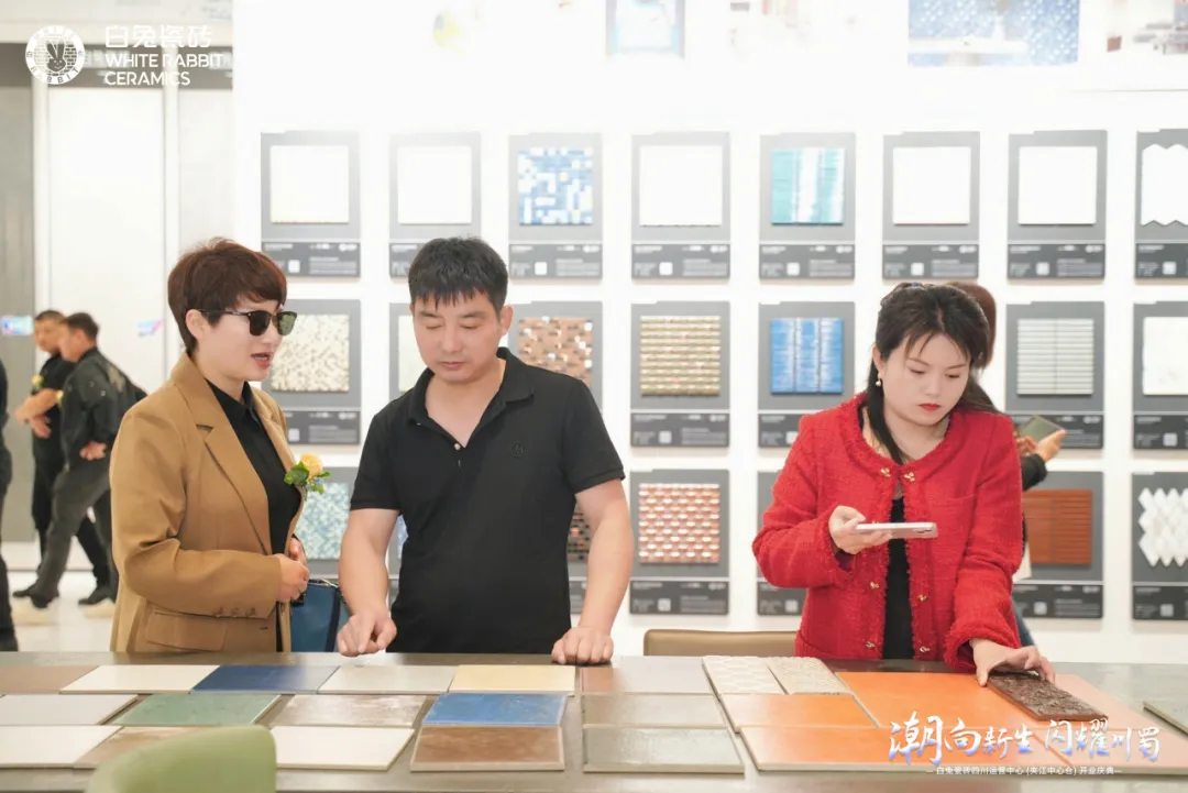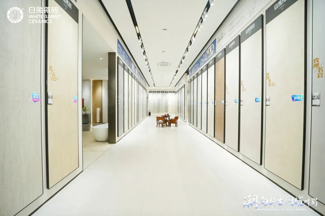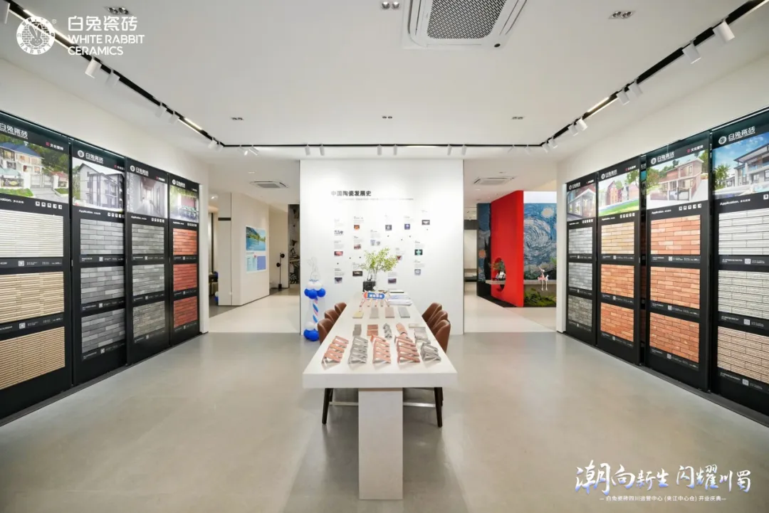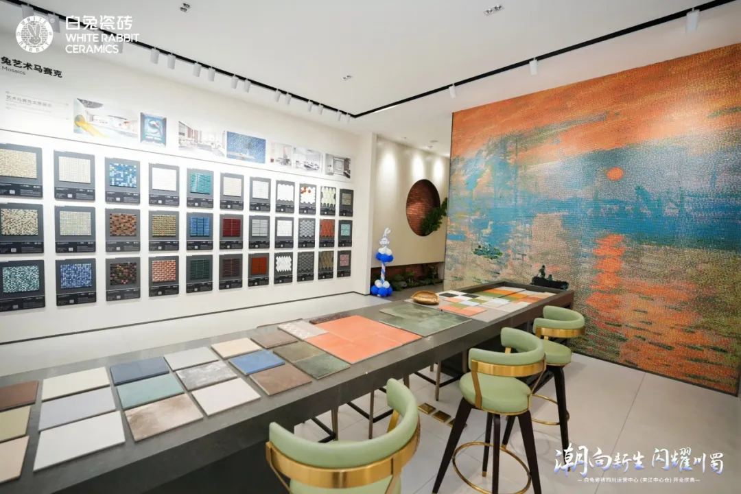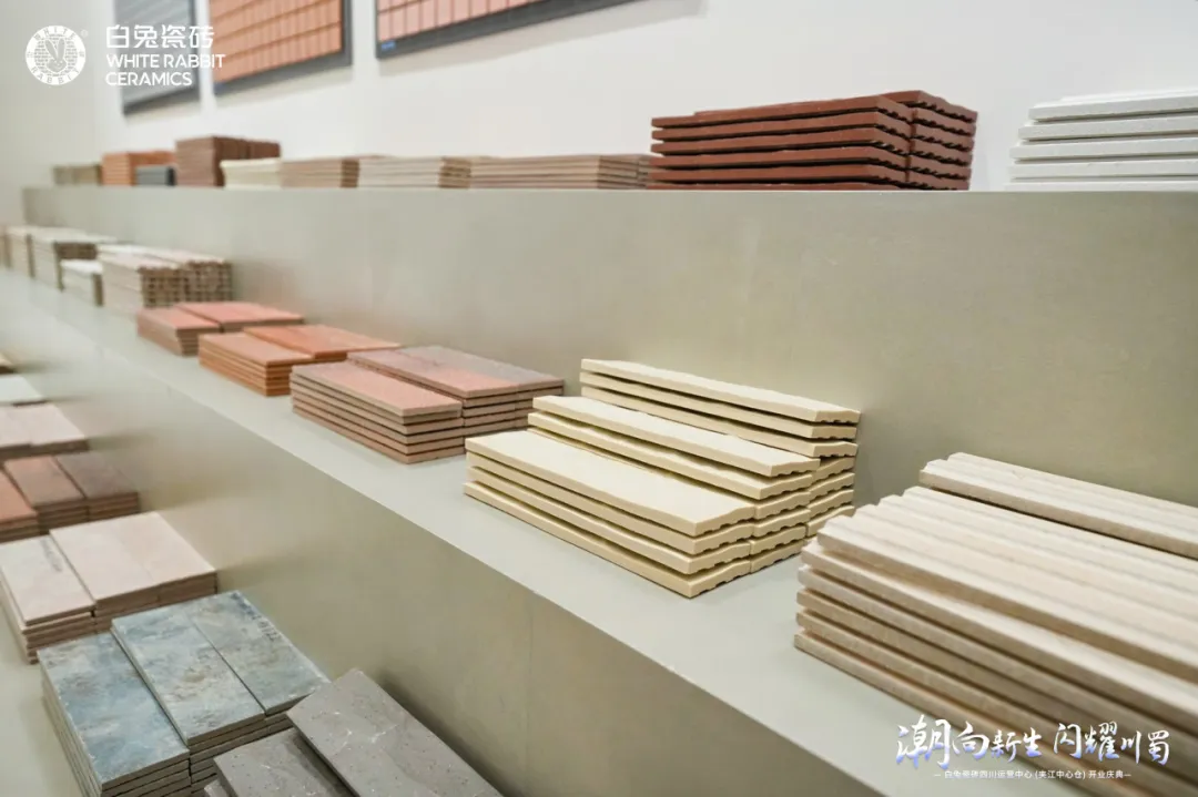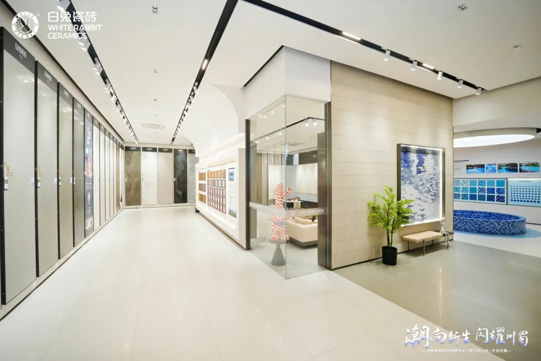 白兔瓷磚四川運營中心(夾江中心倉)展廳內(nèi)新品琳瑯滿目,以臻品墻地磚、藝術(shù)馬賽克、別墅外墻磚/精工外墻磚、小地磚“三磚融和 四磚并驅(qū) 五磚齊發(fā)”的產(chǎn)品品類矩陣,從單品的品質(zhì)細節(jié),到空間多元應(yīng)用,從室內(nèi)室外,到墻上地面,打造一站式選材新體驗,一應(yīng)俱全的產(chǎn)品可滿足多元化的消費需求,構(gòu)建美好的空間想象。