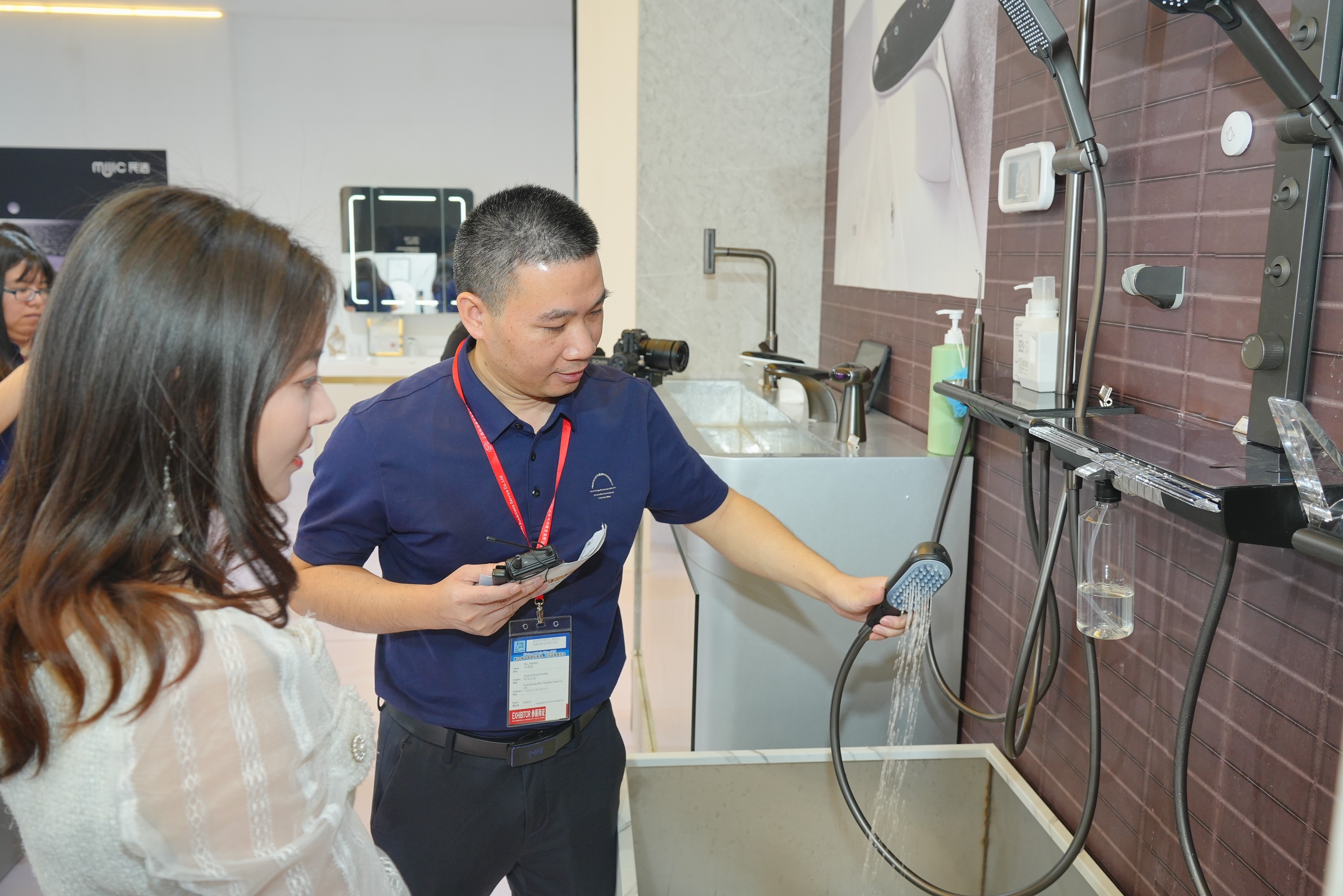 民潔衛(wèi)浴經(jīng)營(yíng)管理部部長(zhǎng)蘇建彬在場(chǎng)的媒體和觀眾介紹了“第五代淋浴”的設(shè)計(jì)理念與五大亮點(diǎn)功能。