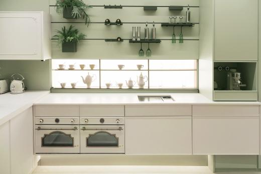 朦朧的陽光,生機盎然的綠植,法薩臺面石以奶油色為基調,一抹綠色抵達視覺深處,治愈又自得,充滿趣味性的變化帶來彌新的感觸,穿著家居服、挽著發絲的在廚房忙碌的優雅女士,仿佛空間自帶浪漫的法式電影感濾鏡。
