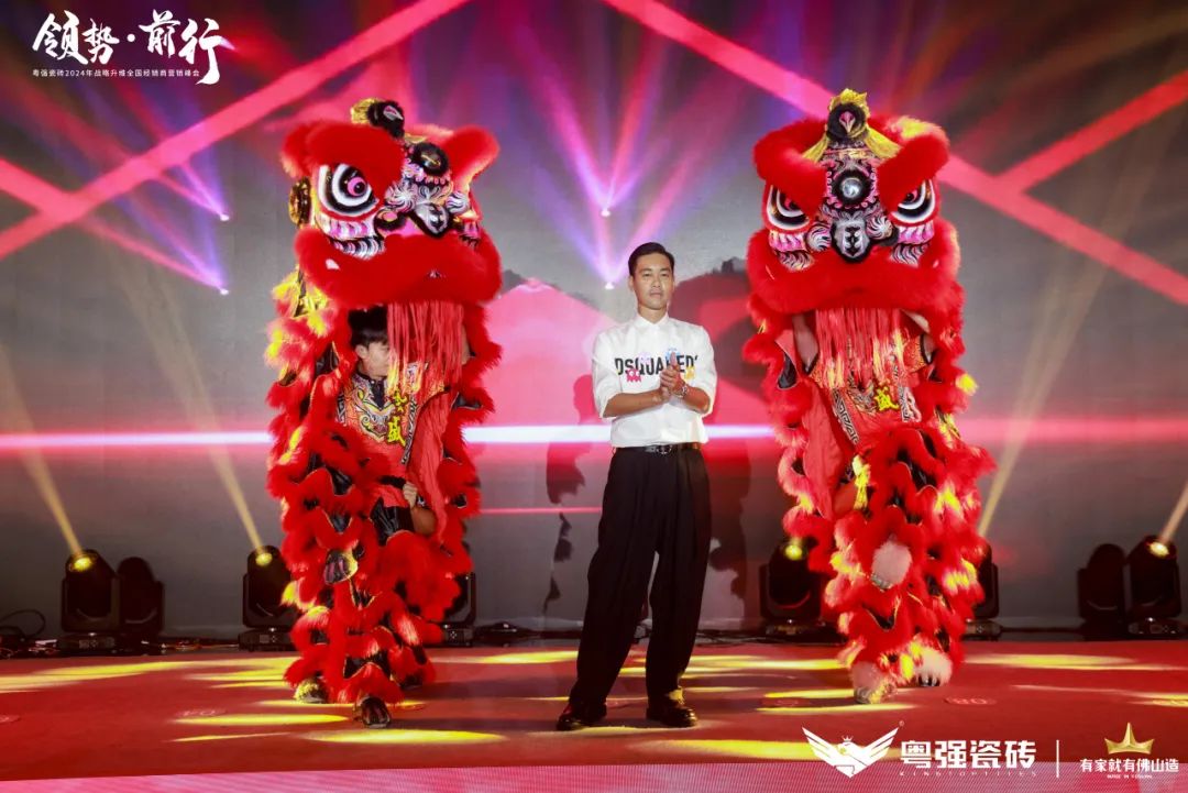 晚宴環(huán)節(jié),粵強(qiáng)品牌代言人陳國(guó)坤先生驚喜現(xiàn)身,引發(fā)全場(chǎng)歡呼,并與舞獅團(tuán)隊(duì)共同表演,把會(huì)議氛圍拉上新一輪高潮。