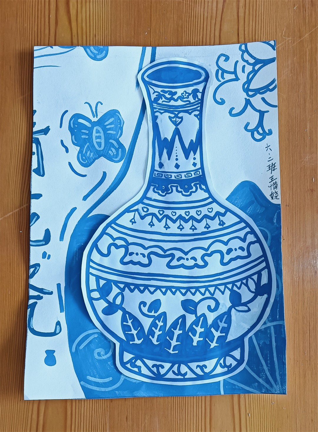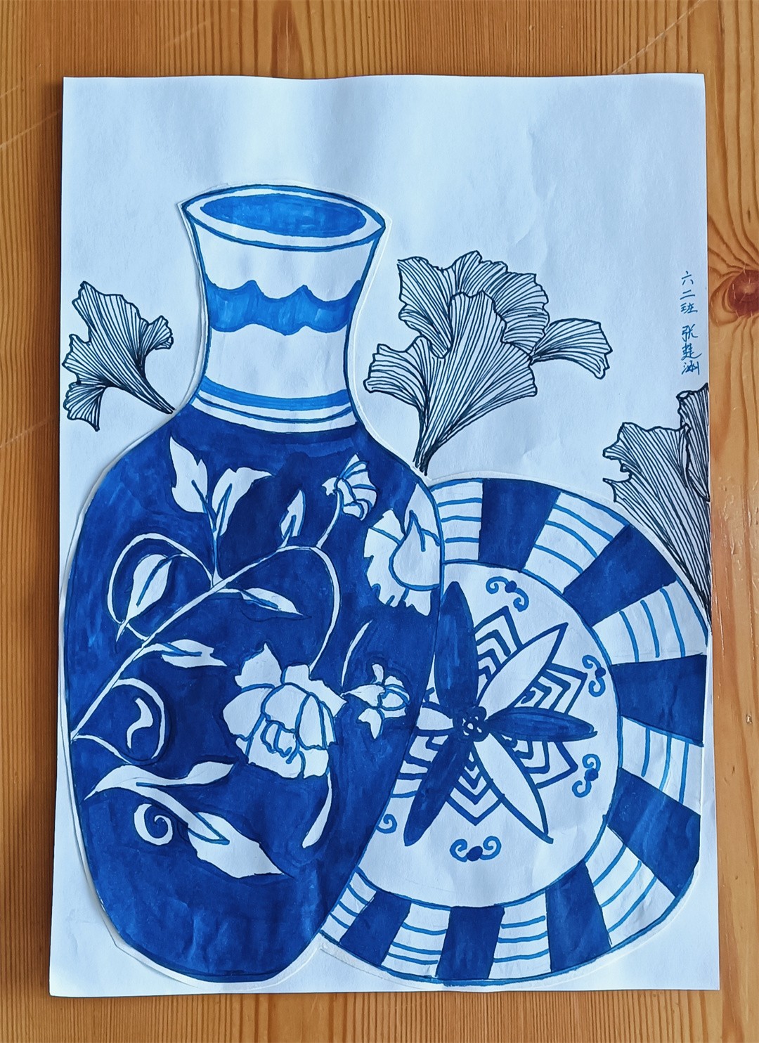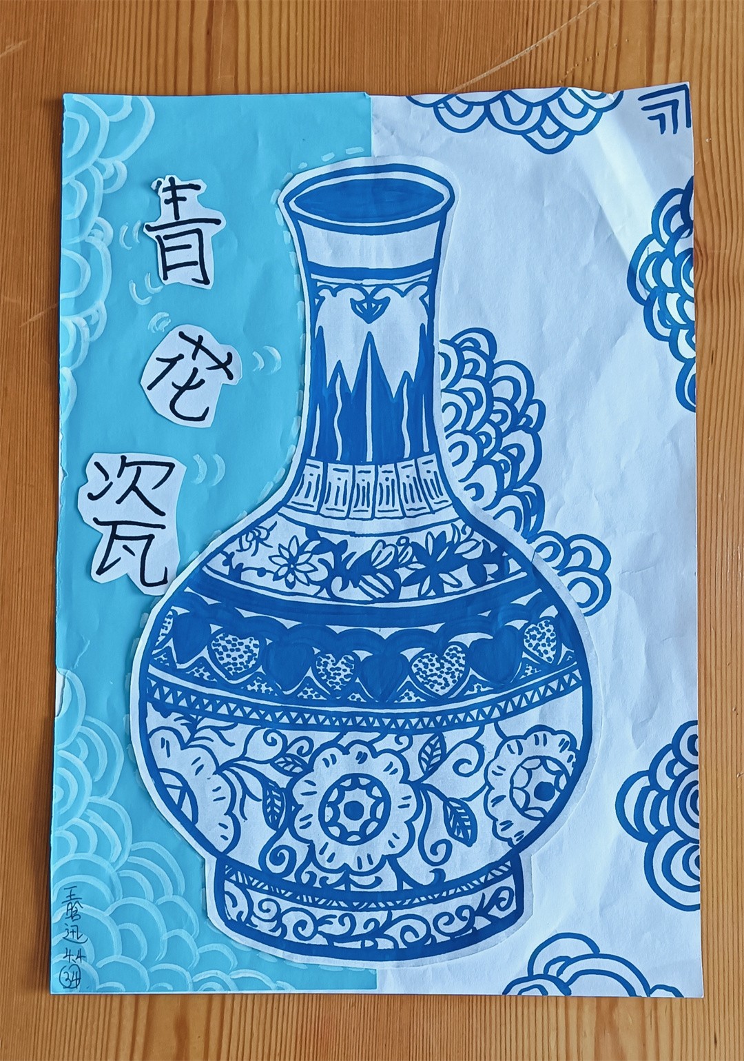 青花瓷線描,1、輪廓起稿,觀察青花瓷圖片資料,用鉛筆分出瓶口、瓶身、瓶底區域,注意線條方向,不是直線條。2、用鉛筆勾勒出花紋,注意用鉛筆時,筆要輕。3、用藍色馬克筆勾勒出花紋,完成后要把鉛筆印擦掉。4、用藍色馬克筆加花紋、畫色塊,刻畫細節部分,使畫面更豐富。最后寫上班級、姓名。隨后,在陶藝老師的指導下,同學們拿起畫筆,巧妙構圖,每一筆細致的勾勒,每一劃深情的描繪,同學們的設計作品,構圖完整,造型可愛,線條流暢自如,展現了同學們獨特的藝術視角和豐富的想象力,每一幅作品,都是同學們對傳統文化的一個深刻詮釋與獨特表達。陶藝課不僅提高了同學們的動手與藝術設計能力、審美能力和創造力,還增進了同學們對青花瓷文化的理解與欣賞,從中了解青花瓷的特點,領略青花瓷的清秀典雅,感受著青花瓷器的精美絕倫。助力同學們在藝術的滋養中茁壯成長。