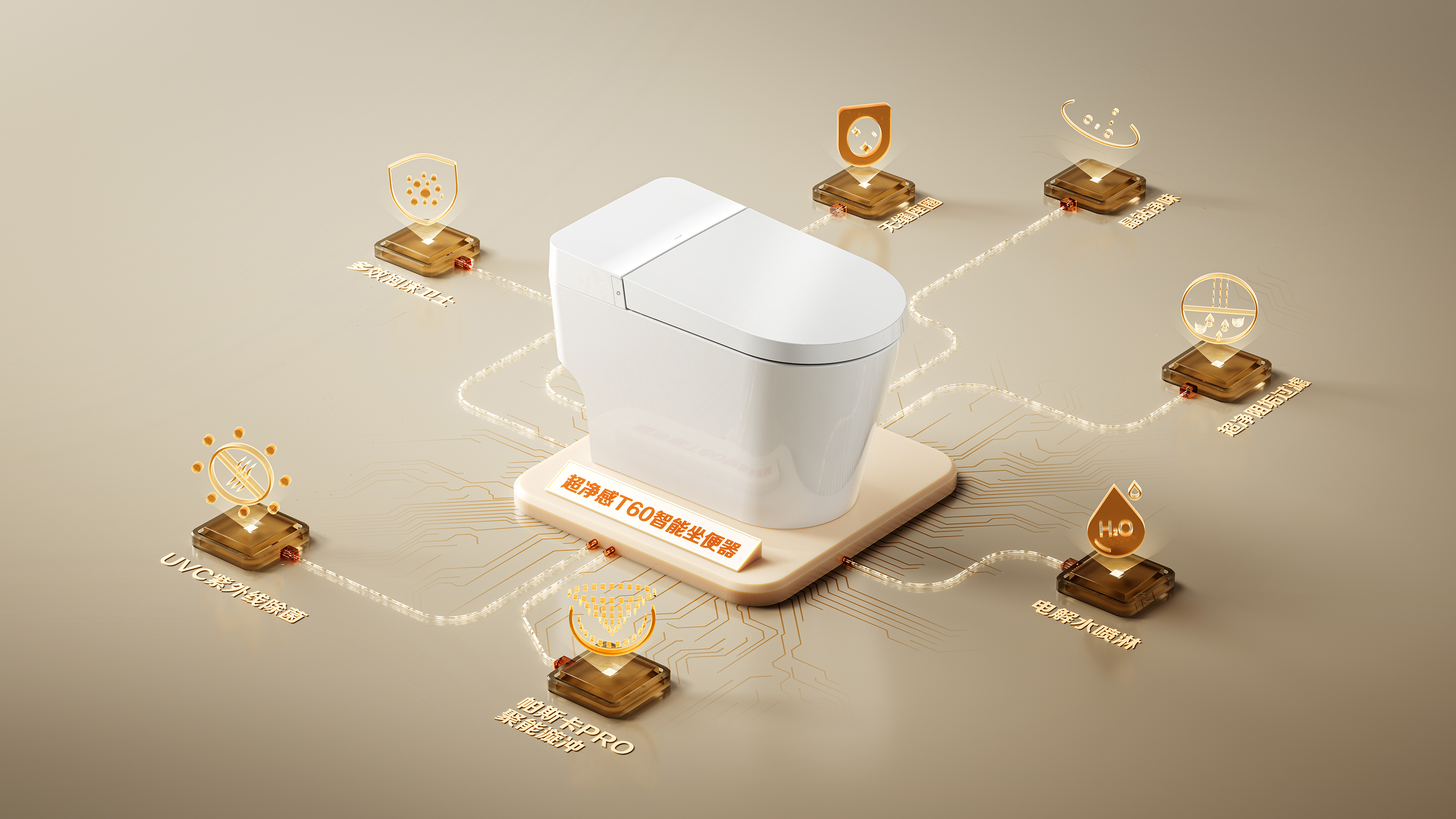 T60以全鏈路抗菌體系,融合材料抗菌科技,從抗菌座圈、水路、內(nèi)壁、水封泡沫盾、除臭、洗護六大關鍵環(huán)節(jié)層層凈化,帶來0顧慮的超凈體驗: UV動態(tài)除菌模組+超凈阻垢過濾+UVC滅菌紫外線瞬時殺菌,水路凈化從源頭把關;內(nèi)壁潔凈同樣細致:漸變曲面導流內(nèi)壁設計讓沖刷無死角,便后電解水自動噴淋內(nèi)壁持久抑菌;T60同步創(chuàng)新晶鉆凈味系統(tǒng),以>90%除臭率保障如廁清新。不僅潔凈舒適,操作便捷性也一脈相承:無需下載APP,NFC靠近即連,貼身數(shù)據(jù)一鍵掌控。