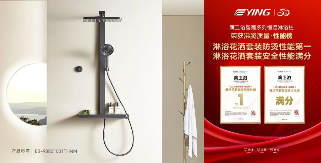 鷹衛浴智雨系列恒溫淋浴柱,內置恒溫閥芯,精準掌控沖淋溫度,時刻溫暖守護,在本次沸騰質量測評中,這款產品同時獲得了防燙性能第一和安全性能滿分,盡顯實力!